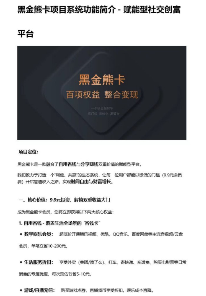 黑金熊卡依托趣吧早已跑通的话费充值、快递折扣等生活服务系统,这次全新推出的黑金熊卡9.9 权益卡,直接整合原有资源,注入 “裂变赚钱” 新基因,从单一省佣平台,升级成 “广告 + 任务 + 人脉 + 生活服务” 四维聚合生态新手也能轻松上手~