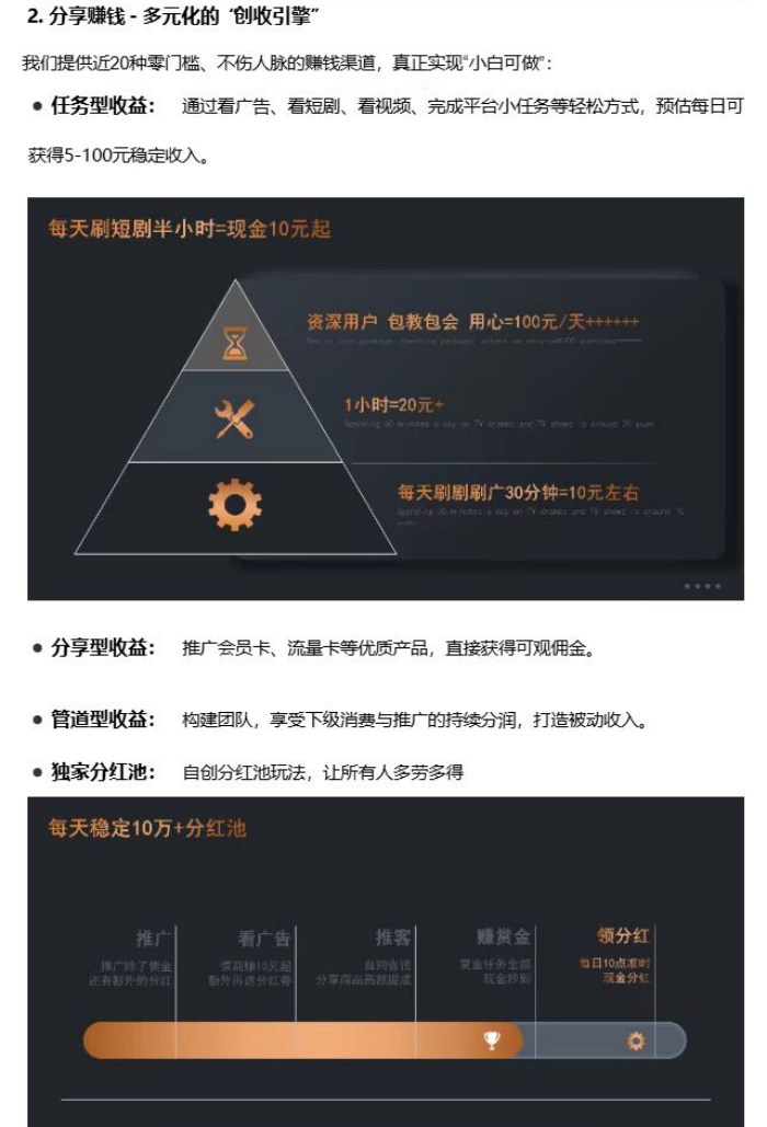 专属推客机制:创新推客玩法搭配分红池模式,自购享半价、分享赚保底佣金,直推佣金高达30%+,实现管道式进金。
